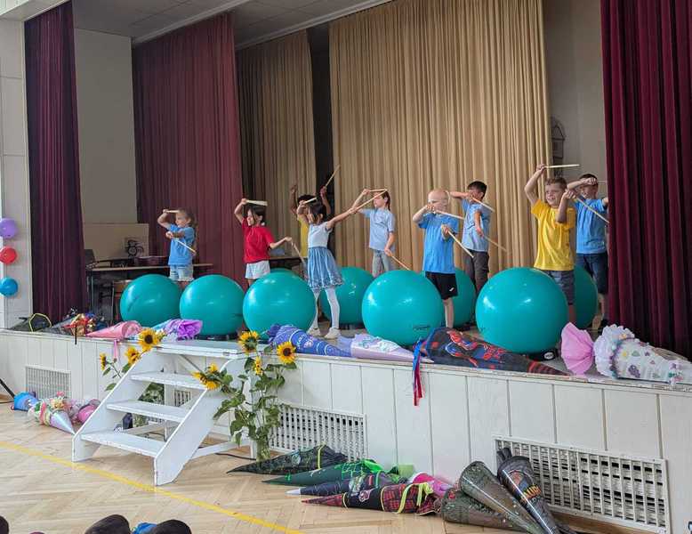 Drumsvorführung und Liedern durch die 1 1/2 stündige Einschulungsfeier.